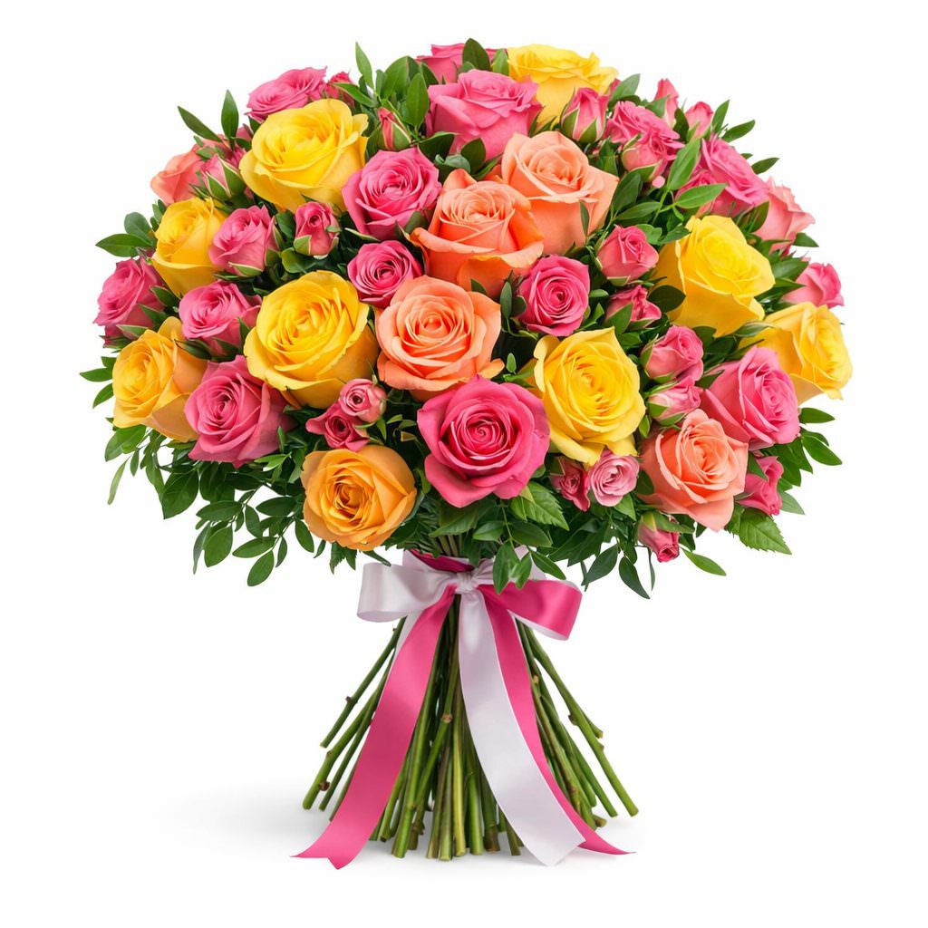 Яркие и жизнерадостные оттенки розового и жёлтого создают атмосферу праздника. В составе букета роза одноголовая макс, роза кустовая розовая и фисташка. Букет украшен белой и розовой лентой, что придаёт композиции изысканность. Этот букет создаёт атмосферу радости и тепла. Прекрасный подарок для любимого человека на день рождения или годовщину.