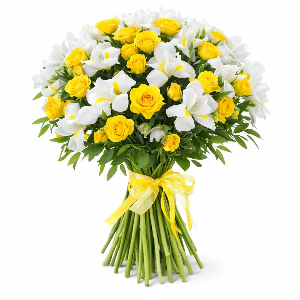 Эта яркая композиция из жёлтых кустовых роз и белых ирисов дарит радостные эмоции. В букете гармонично сочетаются белые ирисы, жёлтые кустовые розы и зелень фисташки. Букет перевязан жёлтой атласной лентой, которая добавляет ему элегантности. Это идеальный подарок для молодой мамы на выписку из роддома.