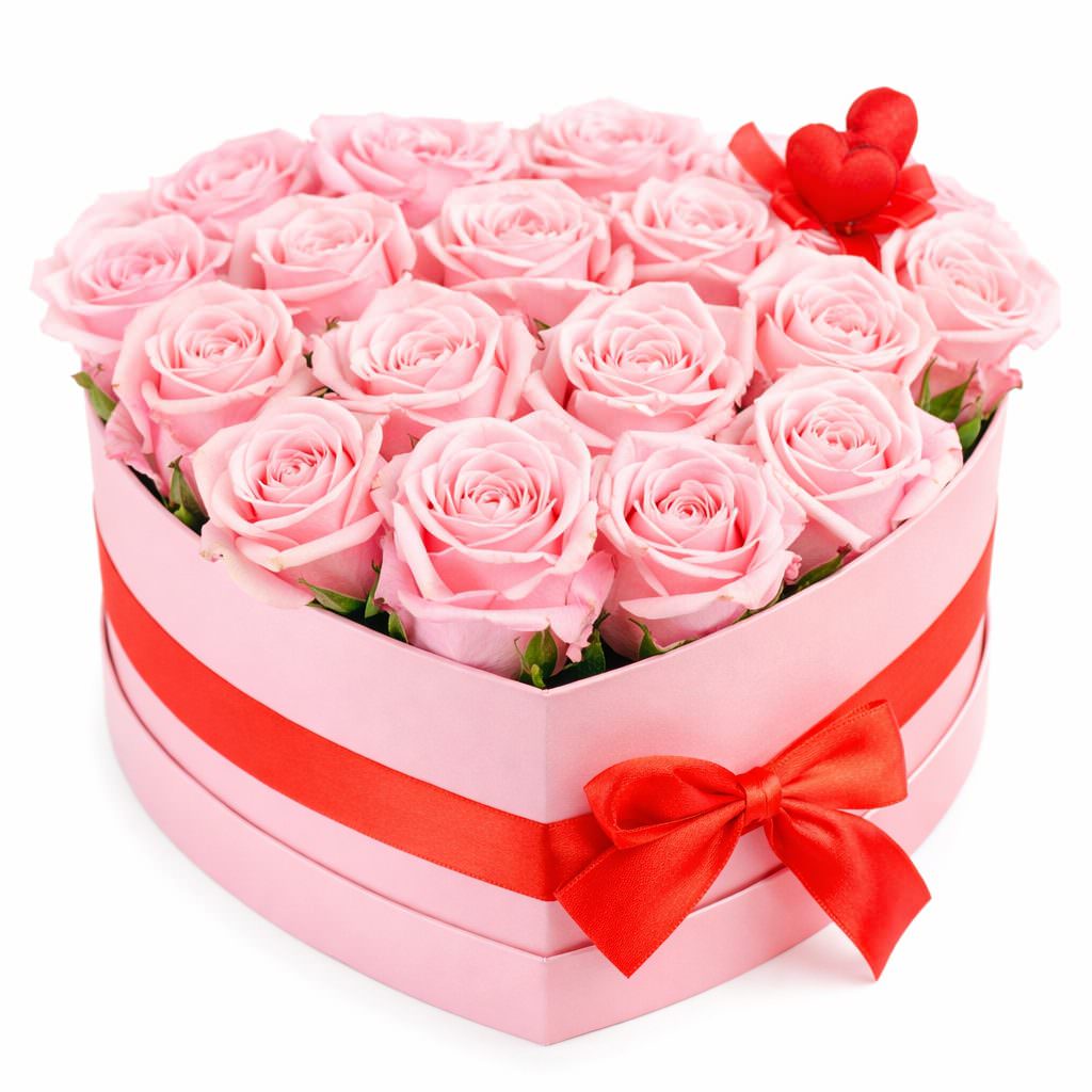 Нежные розовые розы создают атмосферу романтики и утончённости. Композиция состоит исключительно из роз, оформленных в элегантной коробке в форме сердца. Яркая красная лента добавляет акцент и завершает образ. Идеально для подарка на День Святого Валентина для любимой женщины.