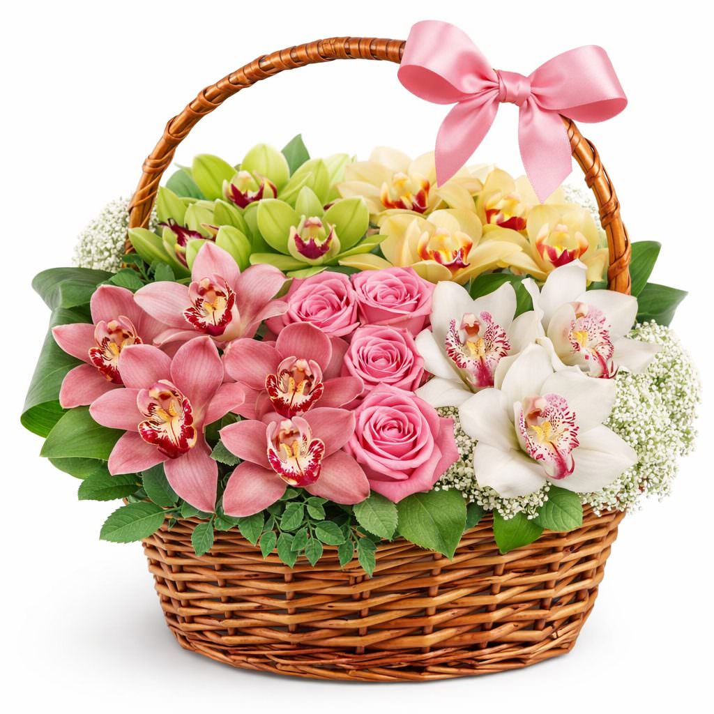 Корзина с орхидеями и розами «Весенний ветер» с гарантией качества, цены и быстрой доставки!