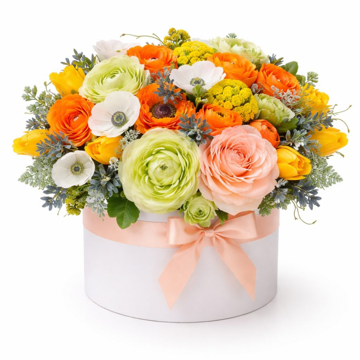 Эта композиция поражает яркими оттенками оранжевого, зелёного и белого, создавая атмосферу радости и гармонии. В составе букета: ранункулюсы, анемоны, пионы и декоративные элементы. Цветы размещены в стильной белой шляпной коробке, которая подчёркивает их изысканность. Этот букет создаёт атмосферу весеннего настроения и подойдёт для поздравления дорогого человека на новоселье.