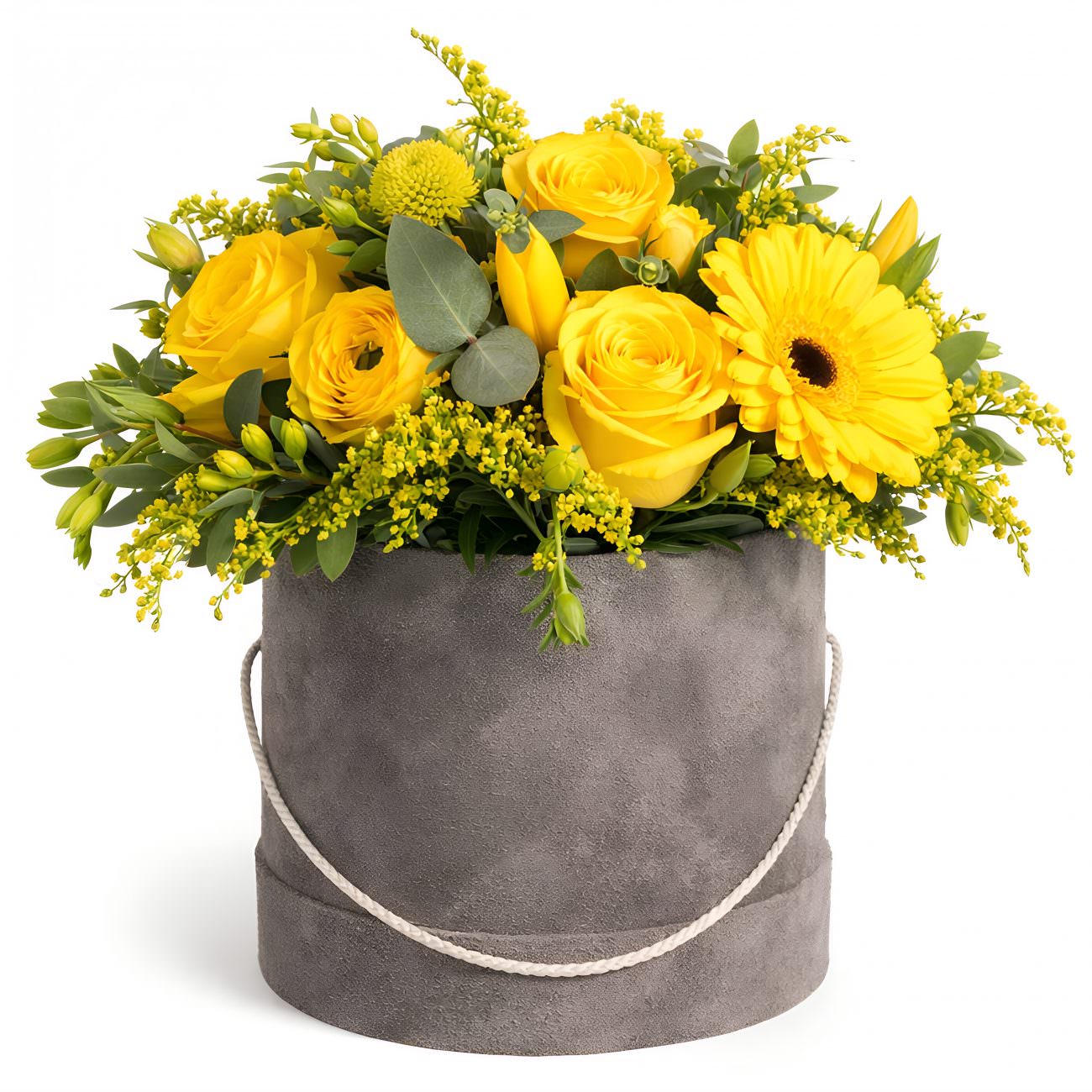 Теплая гамма желтых оттенков дарит ощущение солнечного утра. В составе букета: роза одноголовая желтая, гербера, хризантема кустовая, ранункулюс, тюльпан и фрезия, дополненные эвкалиптом. Композиция оформлена в стильной серой шляпной коробке с текстильной ручкой. Создает атмосферу радости и весны. Идеально подойдет для поздравления любимой женщины на 8 Марта.