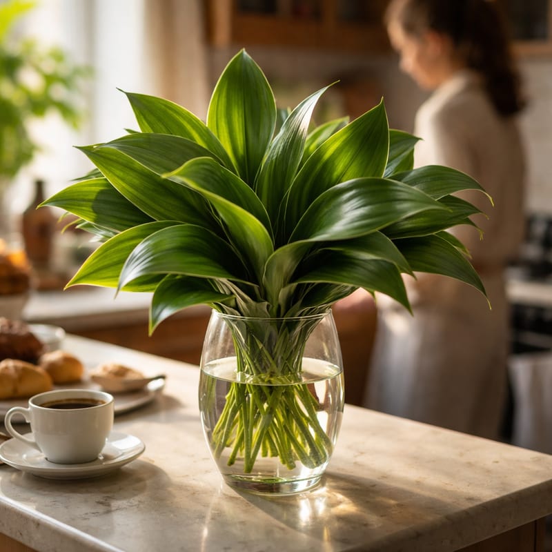 10-14 дней (по основным цветам). Сама аспидистра — 14-21 день в воде, переживёт все цветы букета. Уход: подрезать стебли, чистая вода, менять каждые 3 дня. После того как цветы завянут, аспидистру можно использовать как декоративную зелень в новом букете или поставить отдельно — она сохранит свежесть.