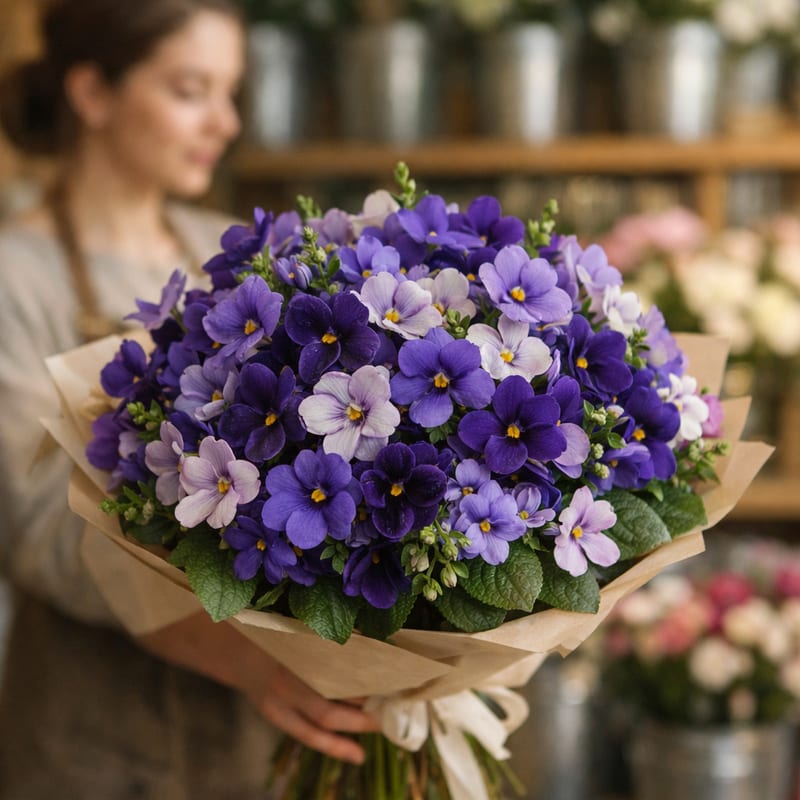 В букетах — фиалка душистая (Viola odorata), сортовая тепличная. НЕ узамбарская фиалка (Saintpaulia, комнатное растение в горшке) — она не годится для срезки. НЕ дикая лесная (часть видов в Красной книге, сбор запрещён). Сортовая Viola odorata — крупнее дикой (1-2 см вместо 0.5-1), ароматнее, легально, стоит 3-5 дней.
