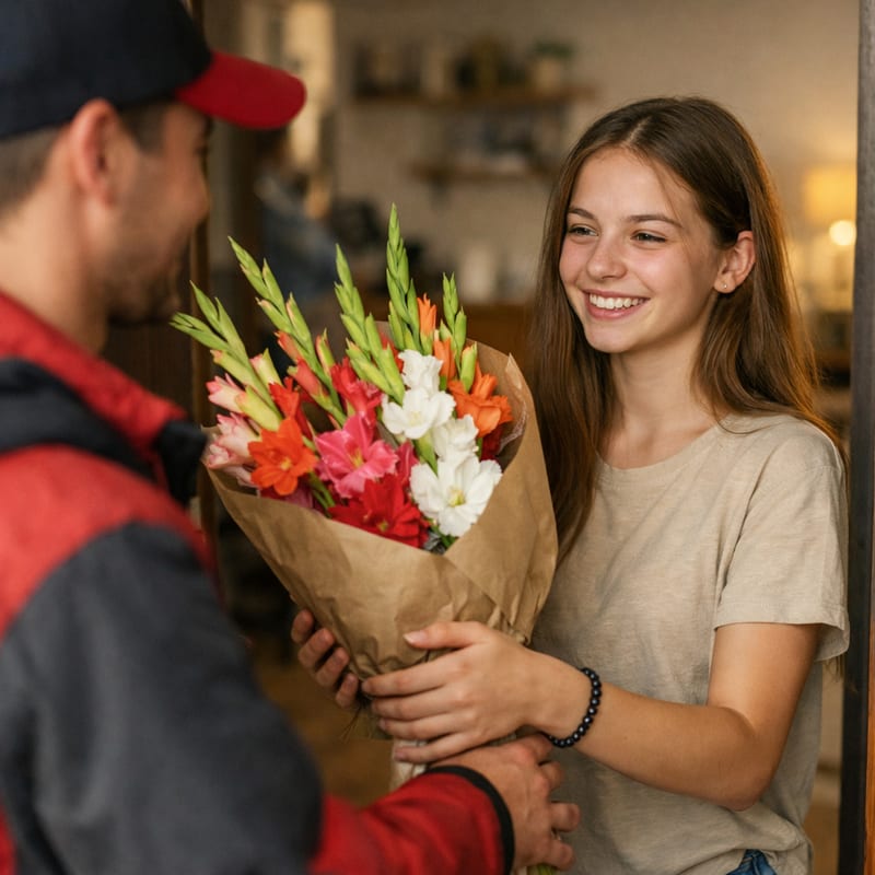 5–7 штук — компактный букет (гладиолусы крупные и высокие, много не нужно). 9–11 штук — пышный, для крупного подарка директору или юбиляру. На 1 сентября учителю — 5–7 гладиолусов нечётное число. Гладиолусы хорошо смотрятся в моно-букете, но микс с хризантемами и гипсофилой делает композицию богаче.