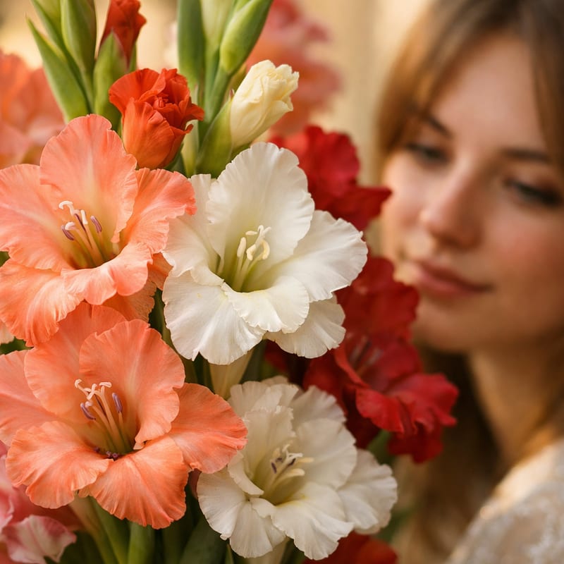 Июль — октябрь, пик август–сентябрь. В сезон российские гладиолусы Поволжья, Кубани, Подмосковья — самая низкая цена и большой выбор расцветок. Вне сезона — голландский импорт круглый год, дороже на 50%. К 1 сентября цены на гладиолусы растут на 30%, закажите за неделю.