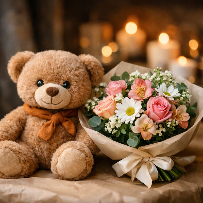 На первое свидание — мишка Тедди 25 см с сердцем (2500 руб.). На 14 февраля — белый медведь 35 см или мишка с надписью «Love» (3500 руб.). На годовщину — большой мишка 50 см с букетом (5000 руб.). Альтернатива — мишка из роз (стоит 5+ лет, не вянет).