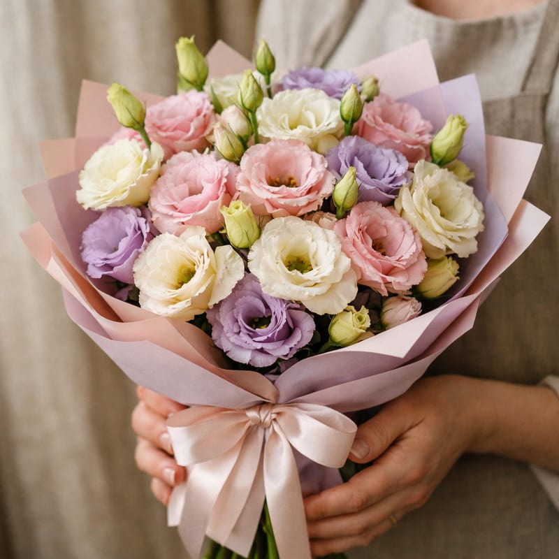 Для скромного букета невесты — 9–11 веток (= 35–60 бутонов визуально). Для пышного — 15–21 ветка. Эустомы хорошо сочетаются с розами, ранункулюсами, лилиями, эвкалиптом. См. букеты невесты в готовых решениях.