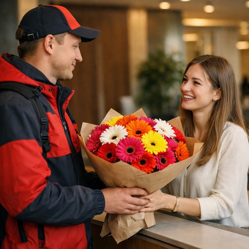 Красная, жёлтая, розовая — от 200 руб./шт. Ассорти 5-цветные премиальные — 280–360 руб./шт. (диаметр 10–12 см против обычных 7–9). Минимум для бесплатно доставки — 500 руб. Готовые букеты с герберами — от 1990 руб., отличные опции подарка подростку.