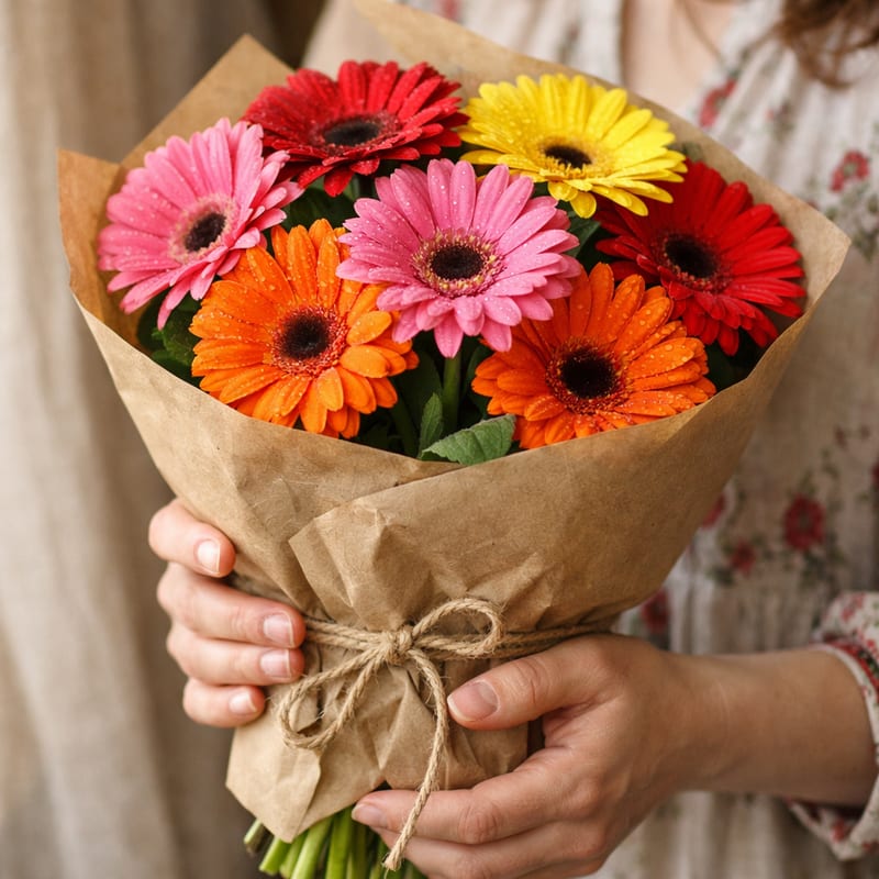 5–7 штук — компактный букет. 11–15 штук — стандартный. 21–25 штук — пышный праздничный. Герберы хорошо смотрятся моно-букетом одного цвета или микс из 5 ярких расцветок. Сочетаются с кустовыми хризантемами, эвкалиптом, гипсофилой.