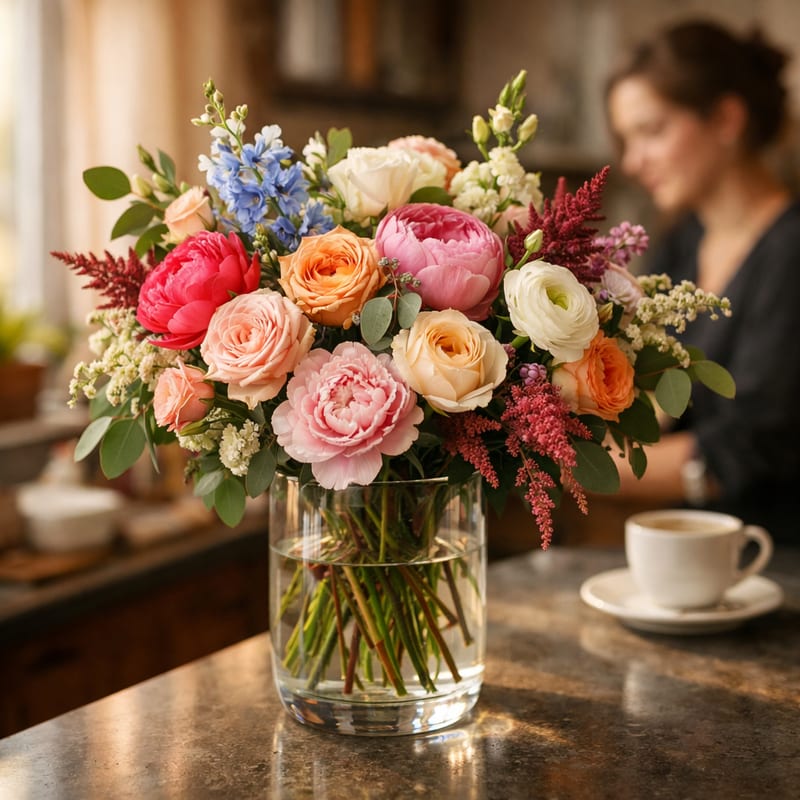 5–7 веток для скромного букета (= 25–50 бутонов). 11 веток — стандартный подарок. 15–25 веток — пышный праздничный букет. На свадьбу или юбилей — 25+ веток. Кустовые хорошо смотрятся моно-букетом одного цвета или микс-букетом из 3 оттенков.