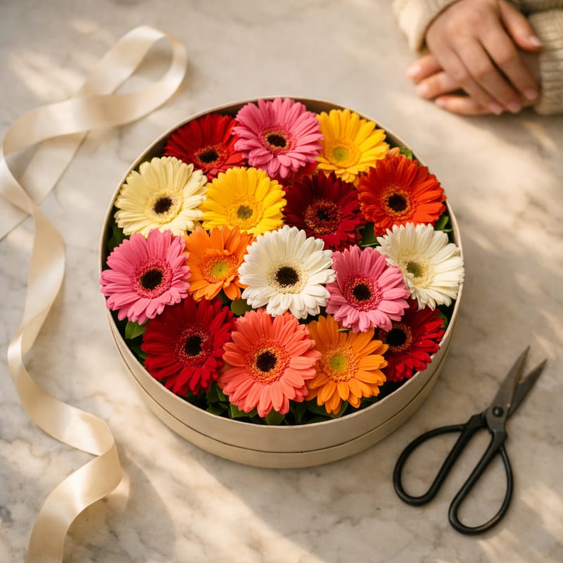 Гербера в коробке — солнечный «улыбчивый» подарок: крупный ромашковидный бутон 8–12 см, яркие оттенки оранжевый/жёлтый/розовый/красный/белый. Стойкость 7–14 дней, цена в 2 раза ниже роз. Идеально для подарка с позитивным настроением. В подборке «МонаФлора» в Салехарде — готовые композиции с герберами в коробке от 2100 руб.: моно ярких цветов, миксы радужные, премиум с зеленью. Трендовые позиции для девушки, ребёнка, на день рождения, выпускной. Доставка за наш счёт от 500 руб., уже за 1-3 часа. См. Также букеты с герберами и герберы поштучно.