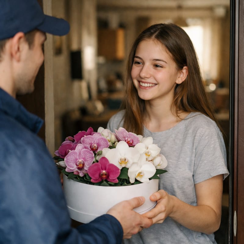 «МонаФлора» — цветочный интернет-магазин в Салехарде и Ямало-Ненецком автономном округе, работаем круглосуточно. Орхидея в коробке стоит 14–28 дней — самая стойкая среди срезанных тропических. Каждый бутон раскрывается по очереди (5–7 на стебле). Привозим в защитной упаковке, не охлаждать (тропики, любят 22–25°C). От 500 руб. Доставка бесплатная, курьеры привезут свежие цветы в течение 2 часов. Дополните премиум-шоколадом, розой в колбе.