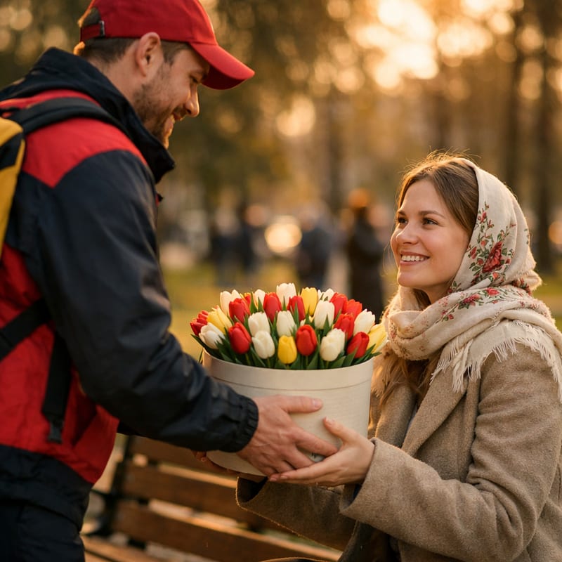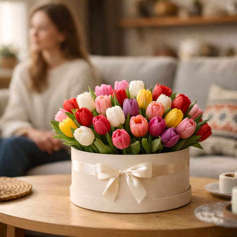 Топ-3: 1) Моно-розовые 51 шт в круглой коробке (4500-5500 руб.) — нежно для жены; 2) Микс пастель (белый+розовый+кремовый) 35 шт в коробке-сердце (3500-4500 руб.) — романтично; 3) Премиум 101 тюльпан (8500-9500 руб.) — для главной женщины. Дополните макарунами или коробкой Ferrero. См. Также цветы на 8 марта.